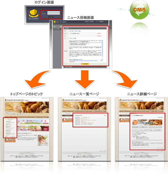 新着ニュースの追加や変更など、即時性の問われる更新はお客様ご自身で簡単にできるように、誰にでも使える、ブログ感覚のCMSによるニュース更新機能を実装。もちろん、無料で好きなだけニュースを投稿する事ができます。